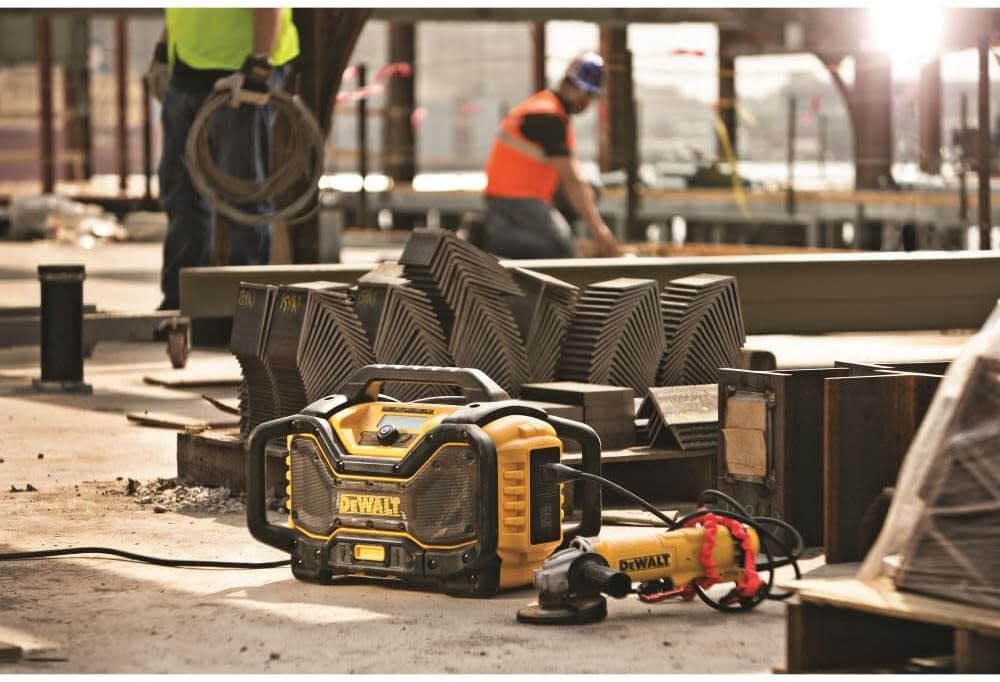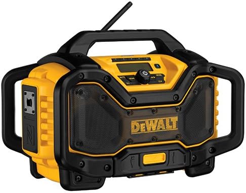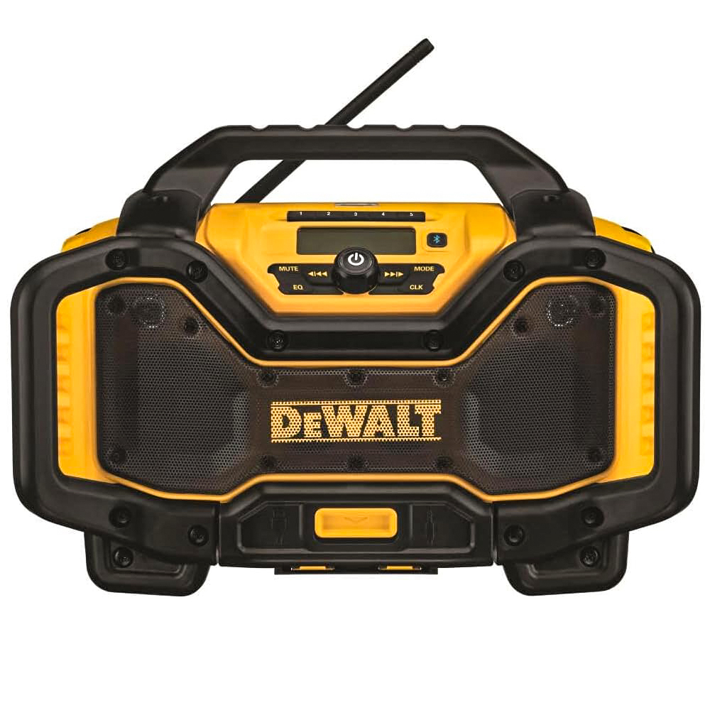 The DCR025 DEWALT radio charger is designed to be the most versatile Jobsite Radio Charger on the market. The unit is able to run off and charge DEWALT slide pack battery packs including 20V MAX* and FLEXVOLT 20V/60V MAX* at 3 AMPs when plugged into an AC outlet. The bluetooth radio speaker is designed to include woofers, tweeters and air ports to provide clear and rich sound at all volume levels. An over sized device storage box protects devices from worksite conditions and includes an Aux and 2.1 AMP USB charging port for convenient device charging. 2 AC Power outlets on the side of the unit allows you to plug in additional tools or chargers without occupying additional outlets on the wall. AVRCP (Audio Visual Remote Control Protocol) allows you to control your device from the radio interface so you can keep the device in a safe place and skip to the next song or hit replay on the radio interface.